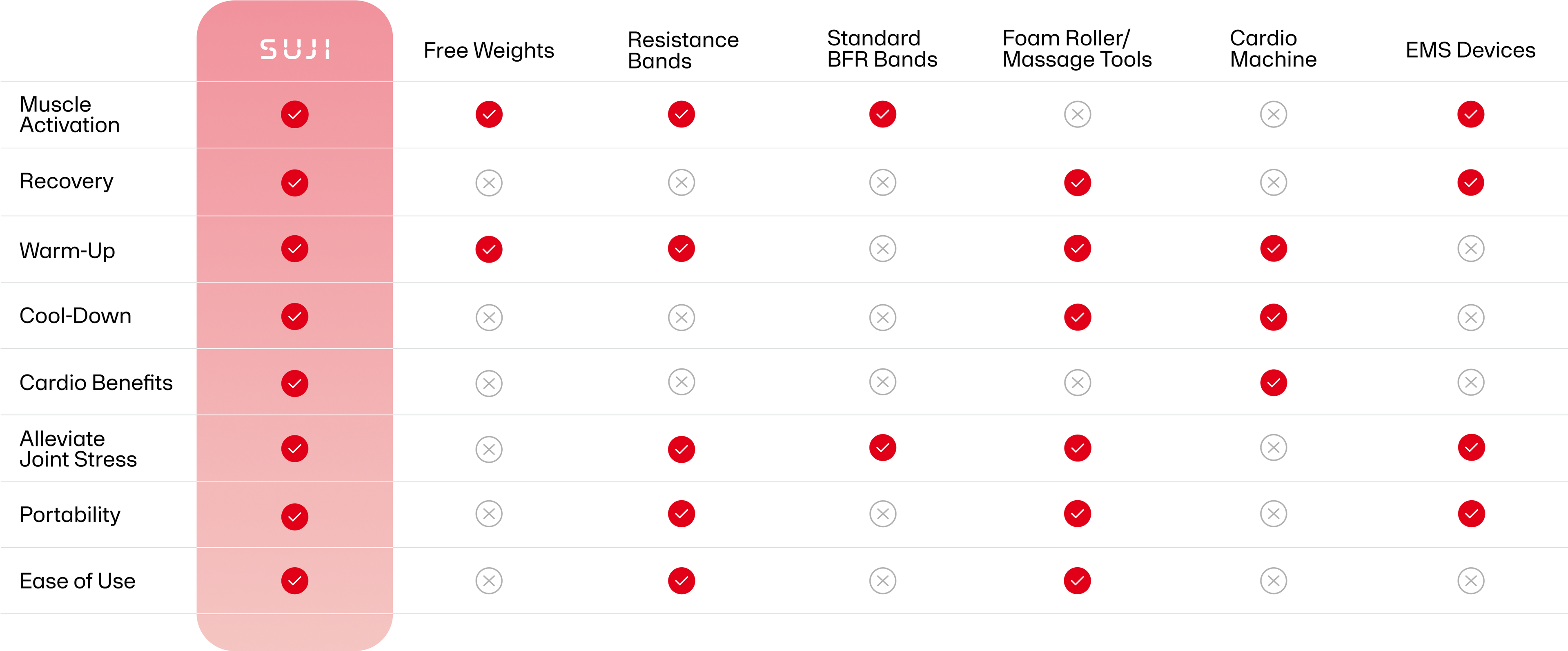 What is Suji? Suji is a smart recovery / training tool that combines targeted compression (a kind of BFR-style approach) with app-guided protocols....