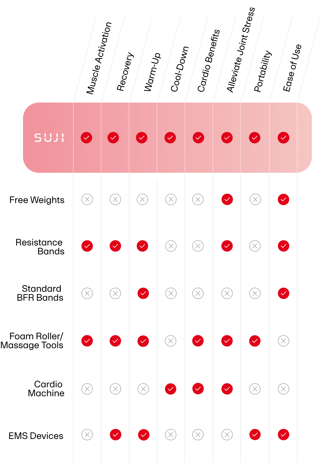 Suji is a smart, portable compression training device that helps you build strength and recover faster without the need for heavy lifting or joint stress. Backed by expert-guided workouts and auto-calibrated compression, it's a smarter way to train and recover.